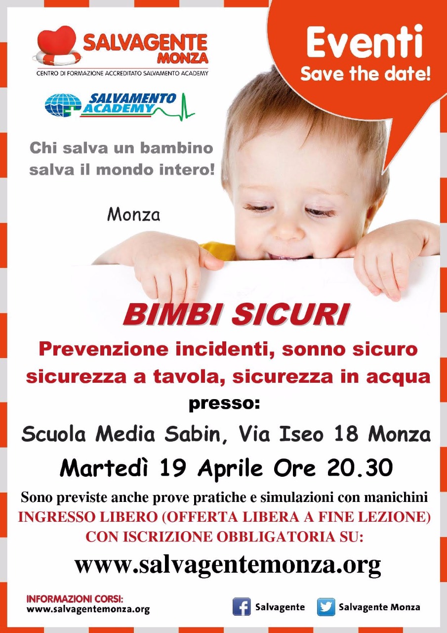 MARTEDI' 19 APRILE ALLE ORE 20.30 verrà realizzato un corso di Disostruzione Pediatrica gestito dall’Associazione “Salvagente” di Monza, ente specializzato nella formazione di tecniche di salvamento e di primo soccorso, al fine di poter affrontare con prontezza e cognizione qualsiasi problema che possa pregiudicare la sicurezza dei nostri bambini.